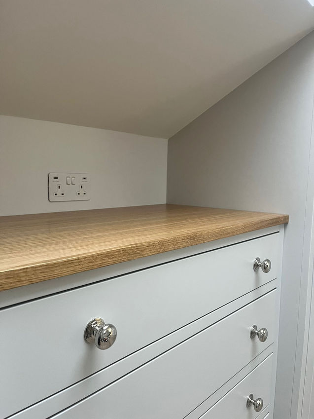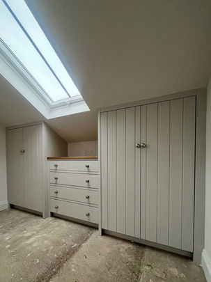 We worked with Hapticity Architects to make and install these bespoke, spray painted wardrobes with oak veneered internals and chrome knobs.