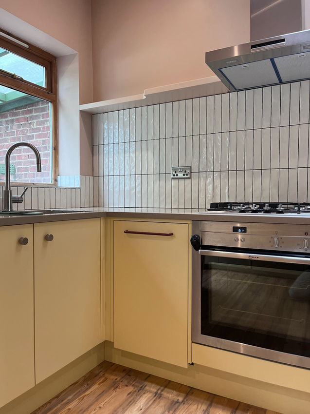 Our clients wanted to use their existing kitchen cabinets but give new life to the tired fronts. We added some additional units to create much needed storage, with custom made new doors in a spray painted butter yellow finish.
