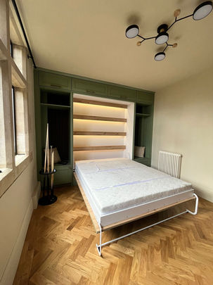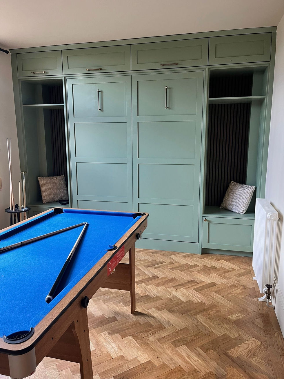 Our client wanted to make best use of this guest room, so we custom built units around a pull-down bed, hand painted in a calming sage green colour. The rest of the room was decorated in a warm beige.